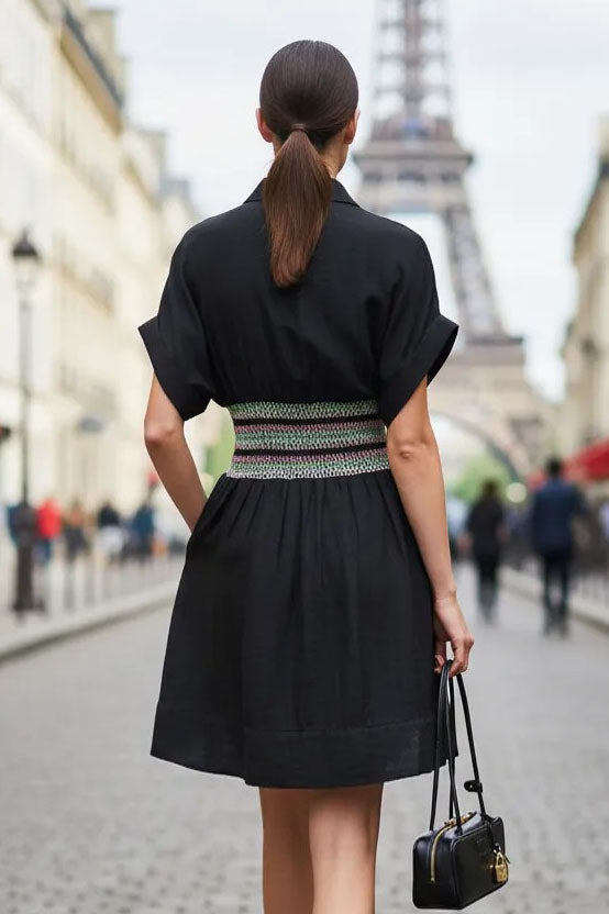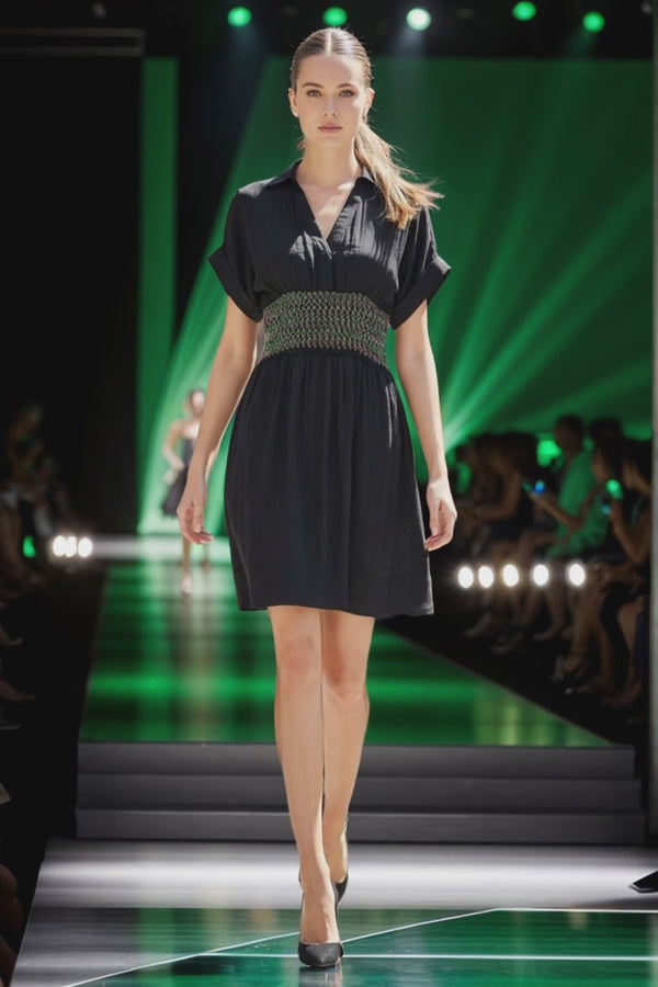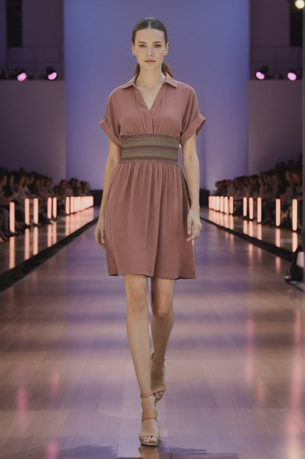 V-neck dress with multi-color waist elastic shirring, bottom fold short kimono sleeve, and side pocket.