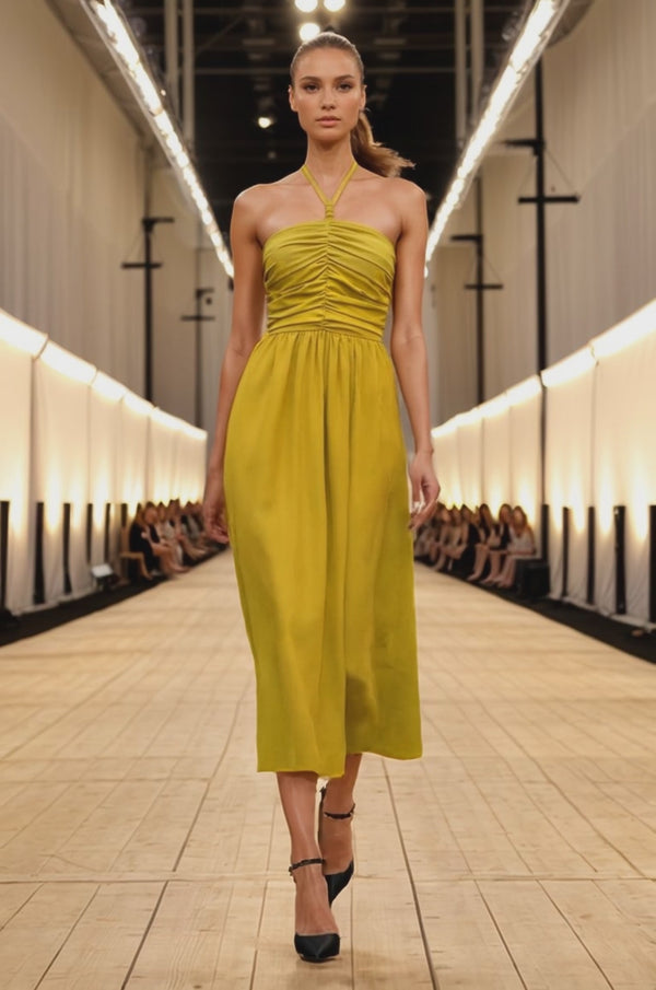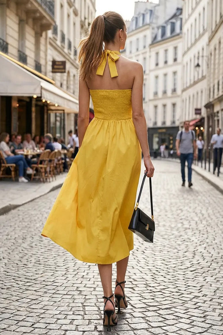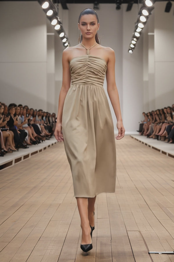 A chic tube halter midi dress featuring front shirring and a stylish front knot detail. The back is designed with elastic shirring for a comfortable fit, and side pockets add practical functionality.