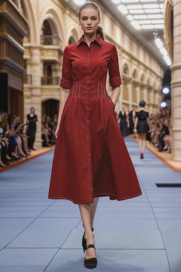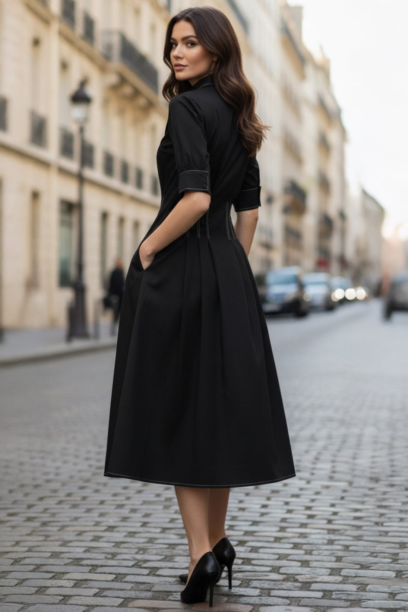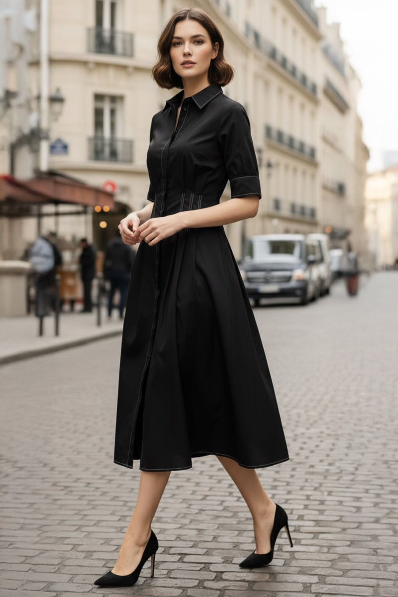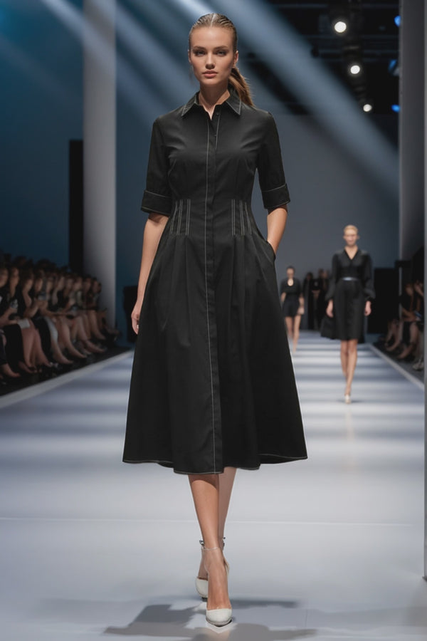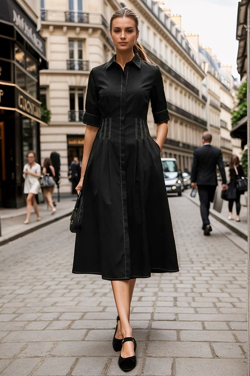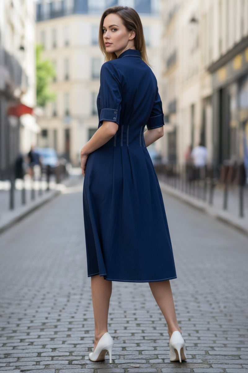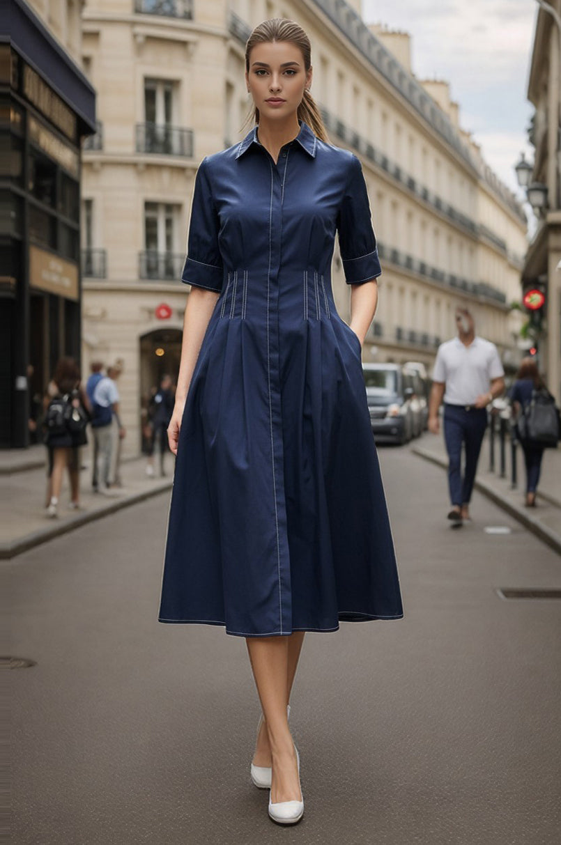 A versatile midi dress with half sleeves, collar, and a button-front placket. Finished with navy contrast stitching and side pockets for both style and function.