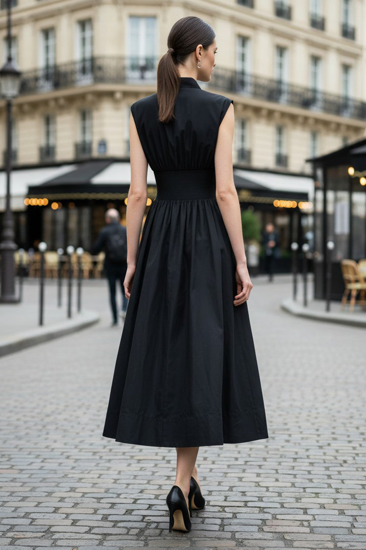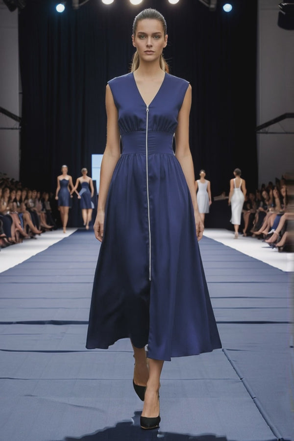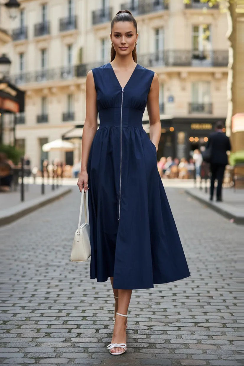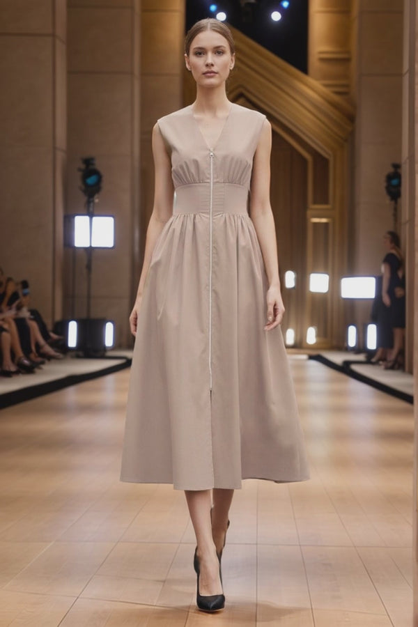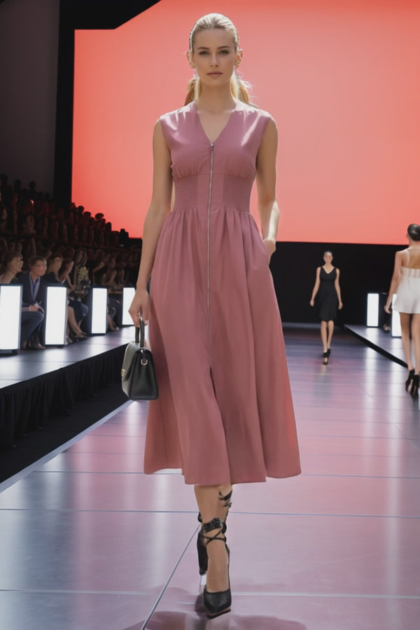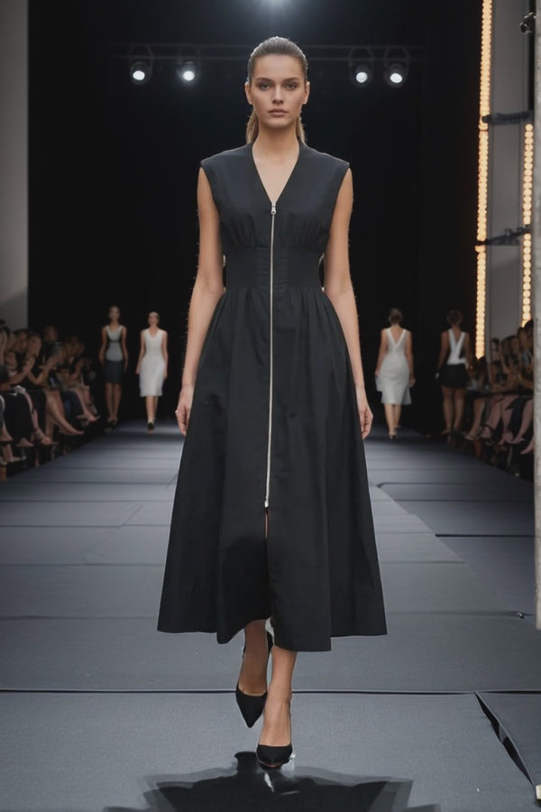 Sleeveless dress with V-neck, long front zipper, and side pocket.