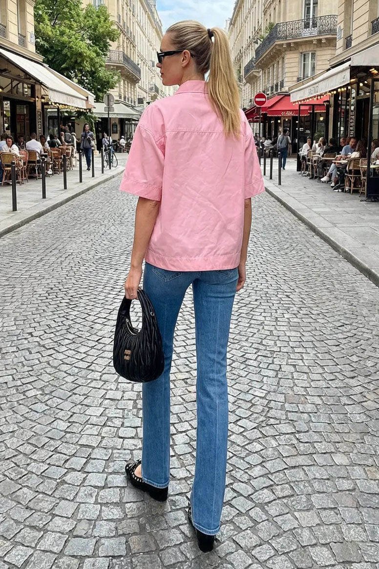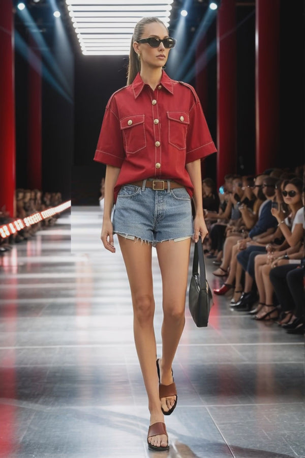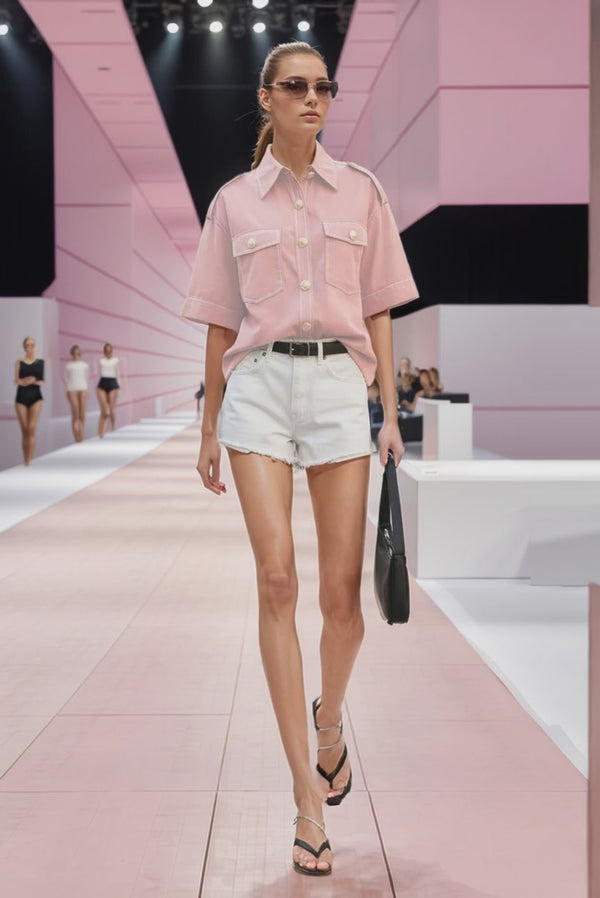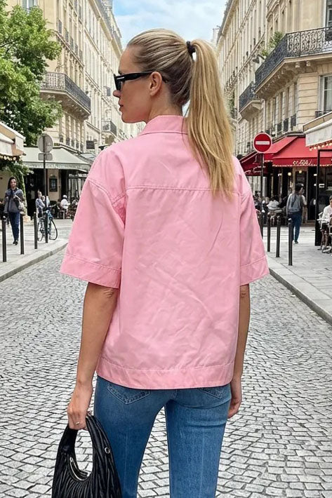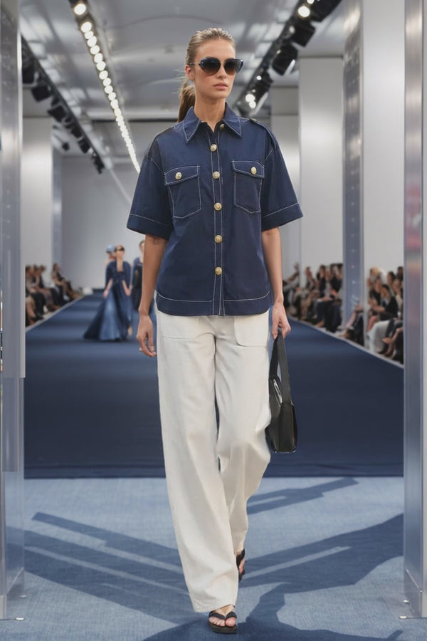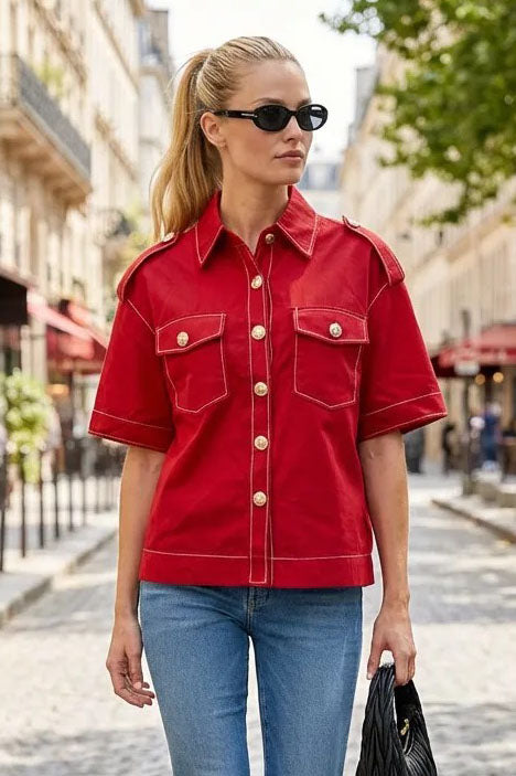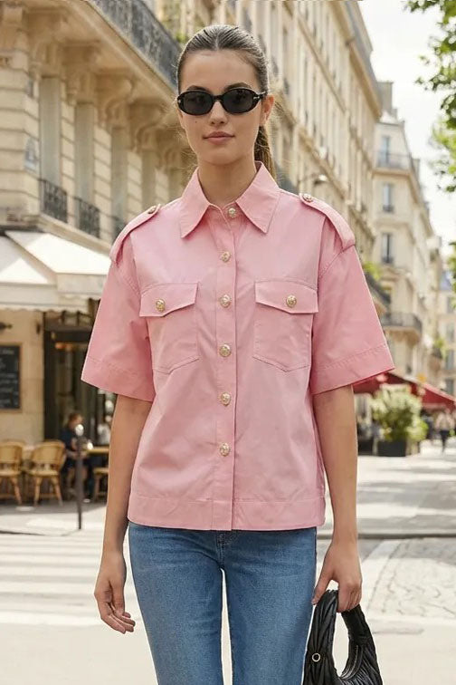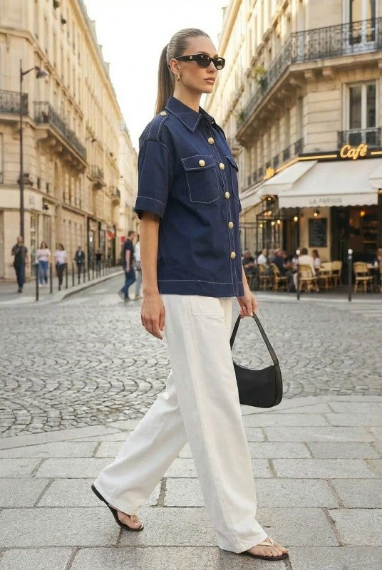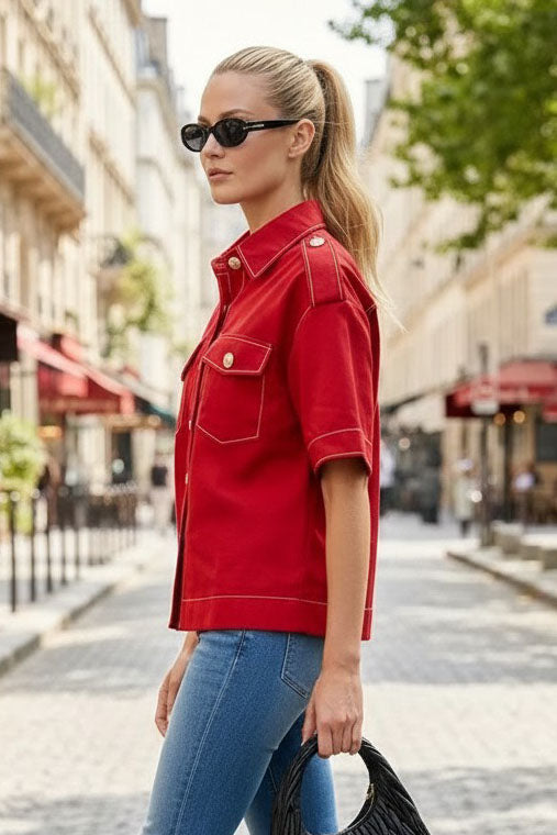 Half sleeve jacket with collar, gold button detail, front pocket, and white stitch detail.