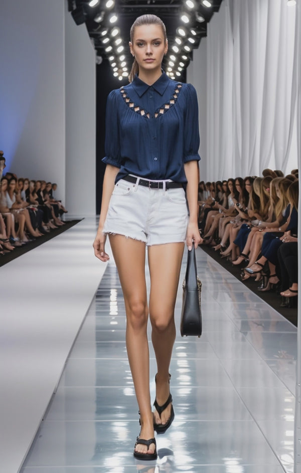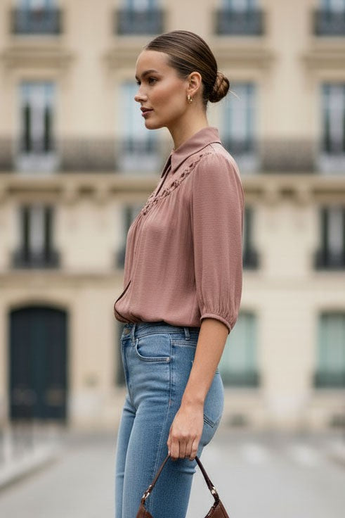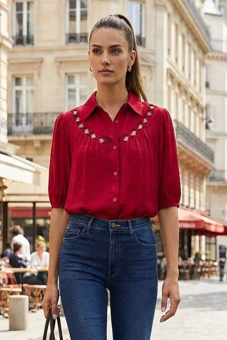 Collared blouse with half sleeve, button up, and cut out yoke detail.