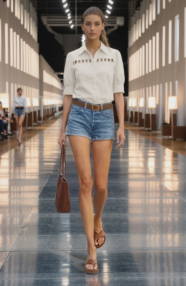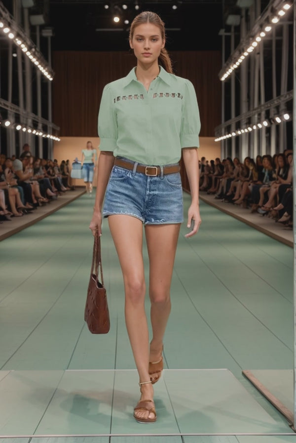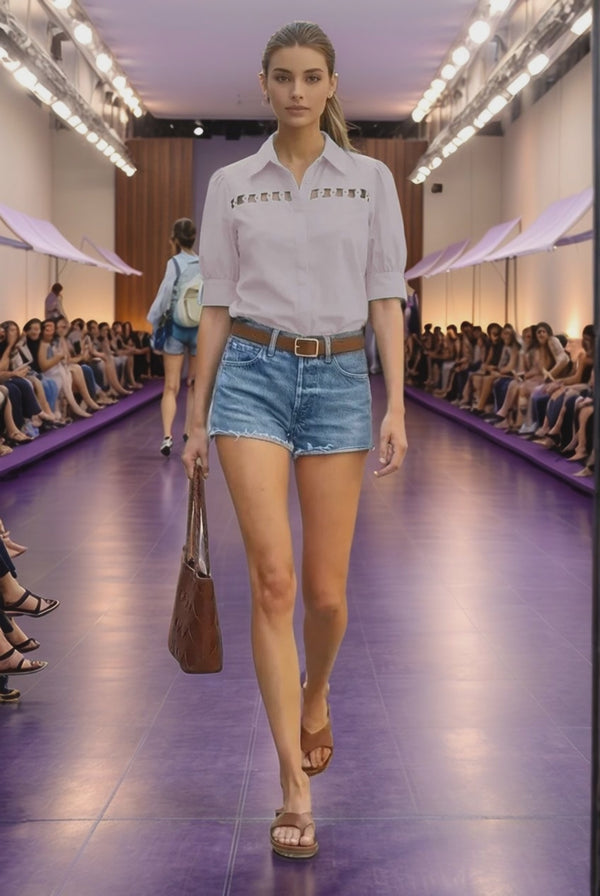 Collared blouse with half sleeve, button up, and cut out yoke with button detail.