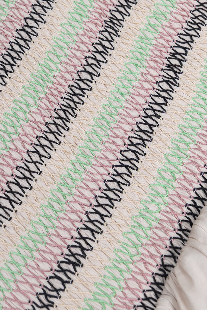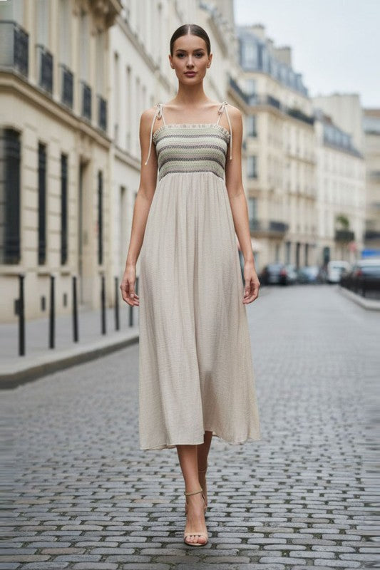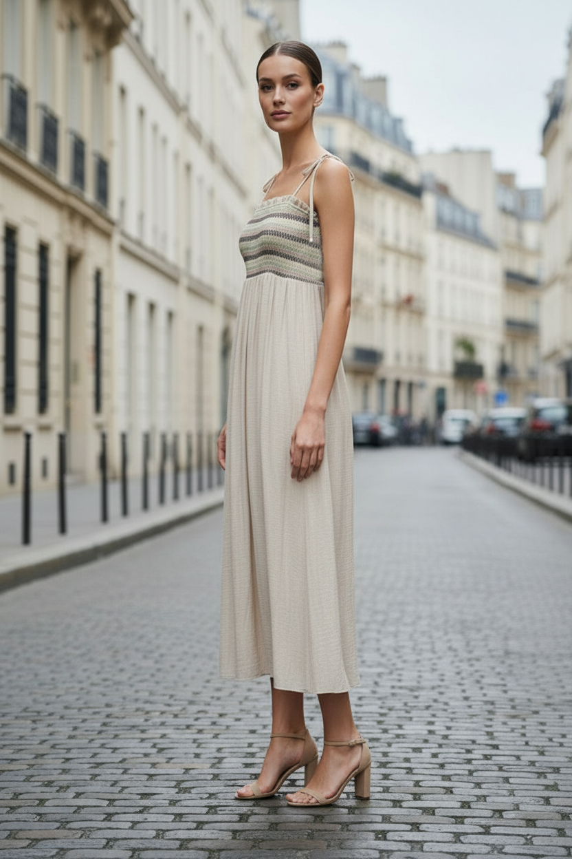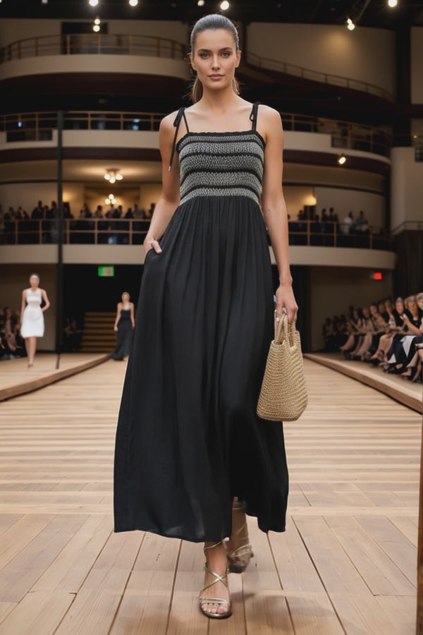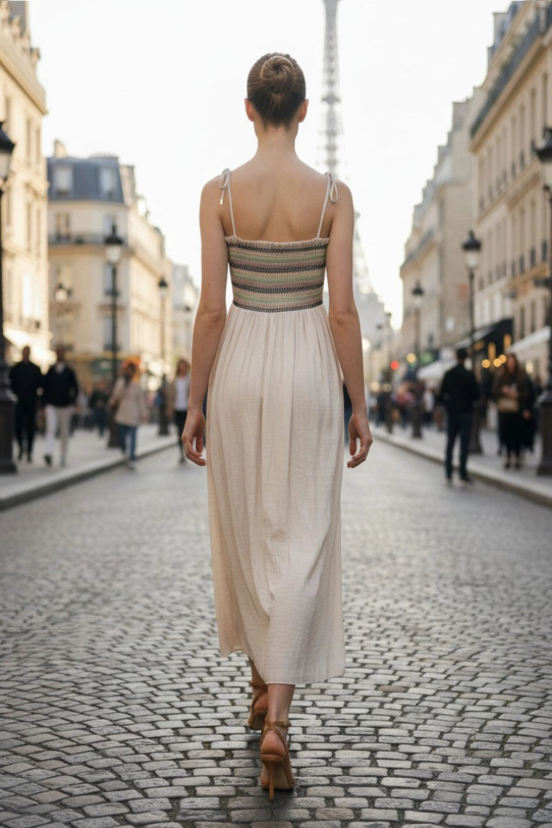 Multi-color elastic shirring tube dress with strap tie shoulder, string bottom metal trim detail, and side pocket.
