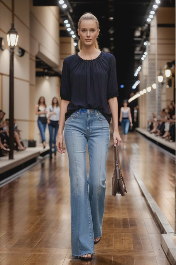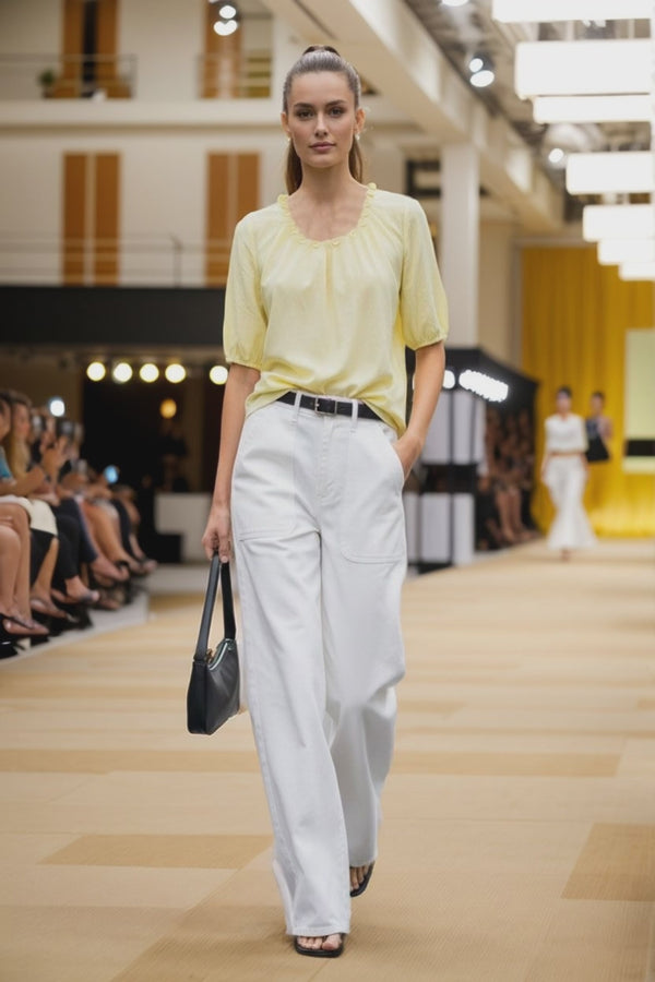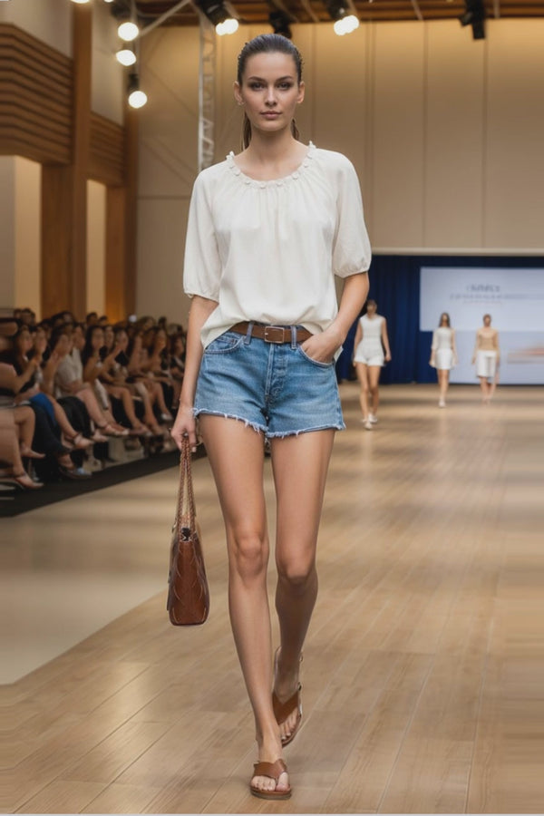Round neck blouse with half sleeve, neckline button detail, and back opening with button.