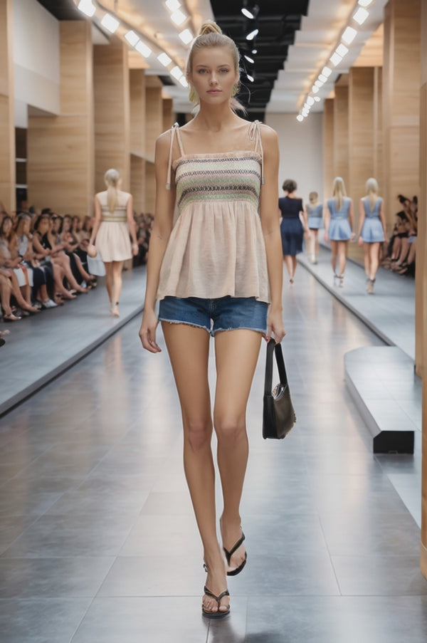 Multi-color elastic shirring tube dress with strap tie shoulder, string bottom metal trim detail,