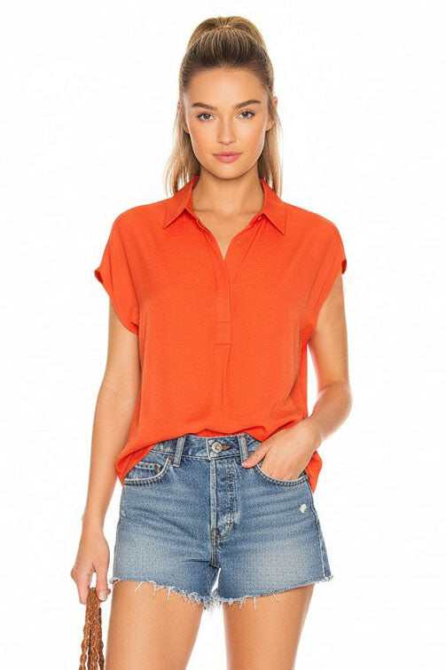 Collared blouse with cap sleeve, button up, and back pleating detail