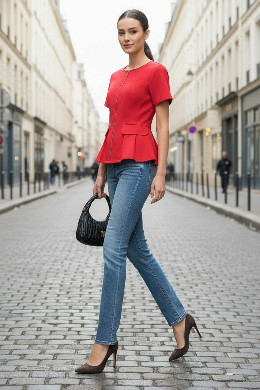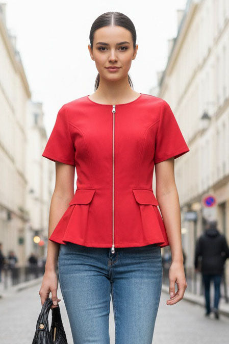 A short-sleeve blouse with 2 way front zipper, front faux pocket details, a round neckline.