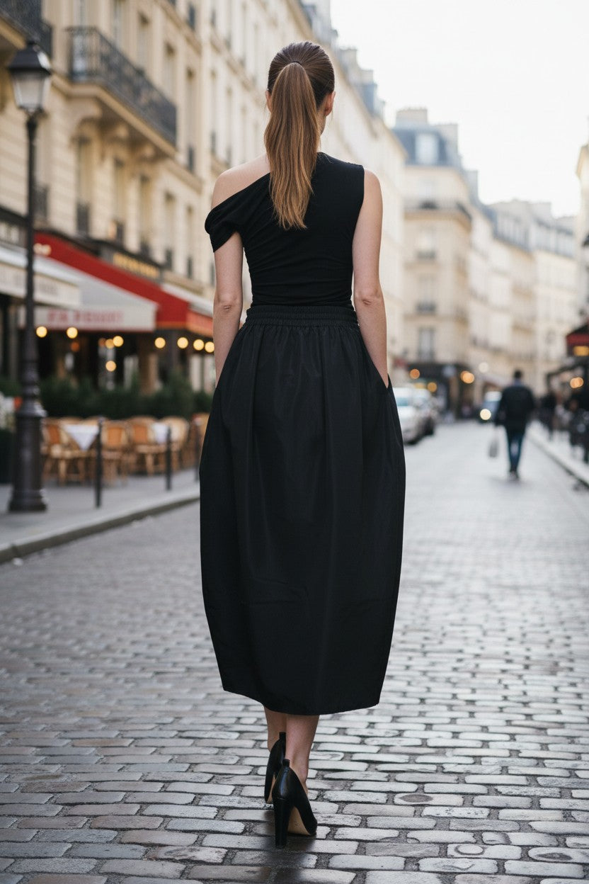 Midi skirt with elastic shirring waistband with adjustable string, string metal detail, bottom adjustable string, and side pocket.